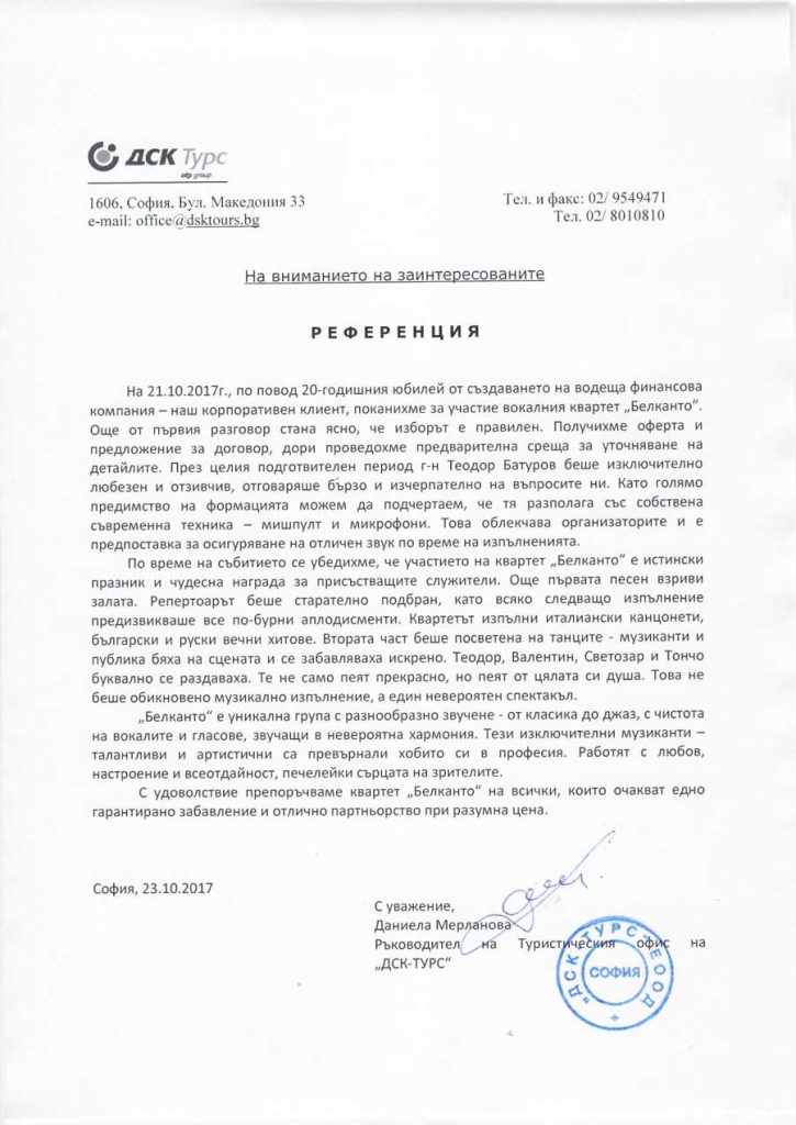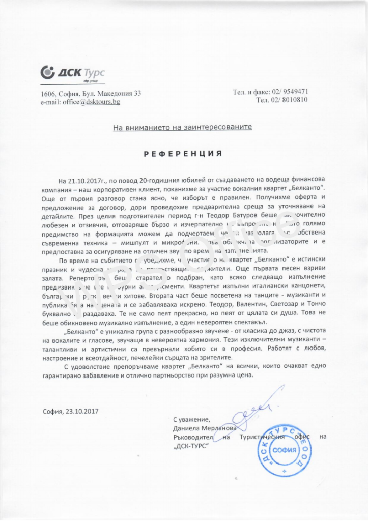 Съвместната ни работа с квартет „ Белканто“ ни дава основание да дадем висока оценка за качеството на тяхната работа.